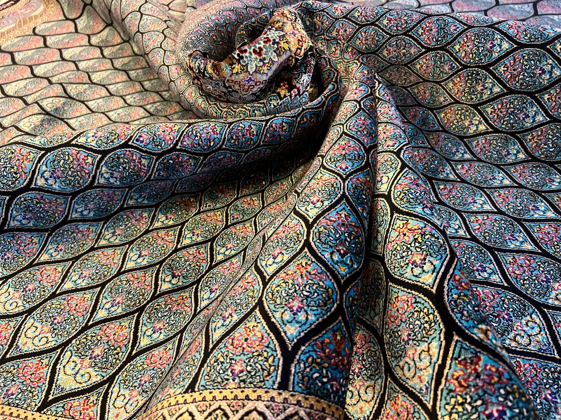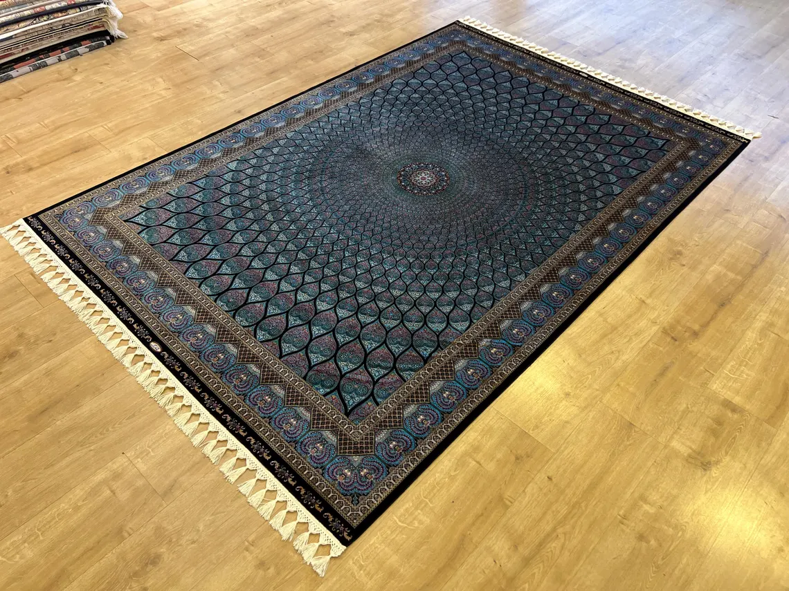 This exquisite rectangular area rug features a mesmerizing, intricate design centered around a delicate medallion, radiating outwards in a captivating mandala-like pattern of interconnected teardrop or leaf motifs. The primary color palette showcases cool tones of teal, aqua, and muted blues, subtly interwoven with hints of soft pinks, lavender, and beige, all set against a sophisticated dark, possibly black or deep navy, background that makes the lighter colors pop. A richly detailed border frames the central pattern, incorporating traditional floral and scrollwork elements in complementary shades, culminating in elegant fringed edges that add a touch of classic charm, making it a stunning focal point for any room.