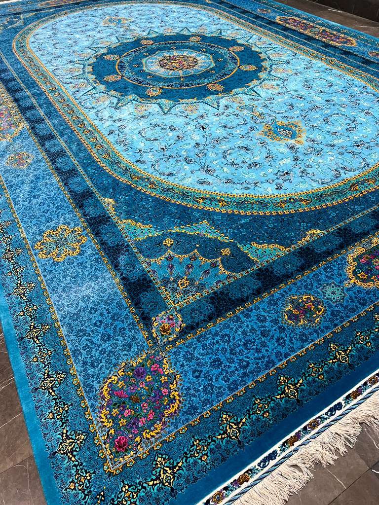 Transform your space with the majestic beauty of this Luxury Persian Medallion Area Rug. Featuring a brilliant spectrum of Deep Sapphire and tranquil Sky Blue, this carpet boasts an intricate traditional pattern centered around a grand medallion. The design is richly detailed with exquisite floral motifs in contrasting gold and vibrant jewel tones of rose and violet, creating a breathtaking visual tapestry. Crafted from premium, silk-soft fibers, this rug offers a luxurious underfoot feel while being durable and easy to maintain. Perfect for anchoring your living room, dining area, or master bedroom, this stunning piece brings a touch of royal elegance and timeless tradition to any decor.