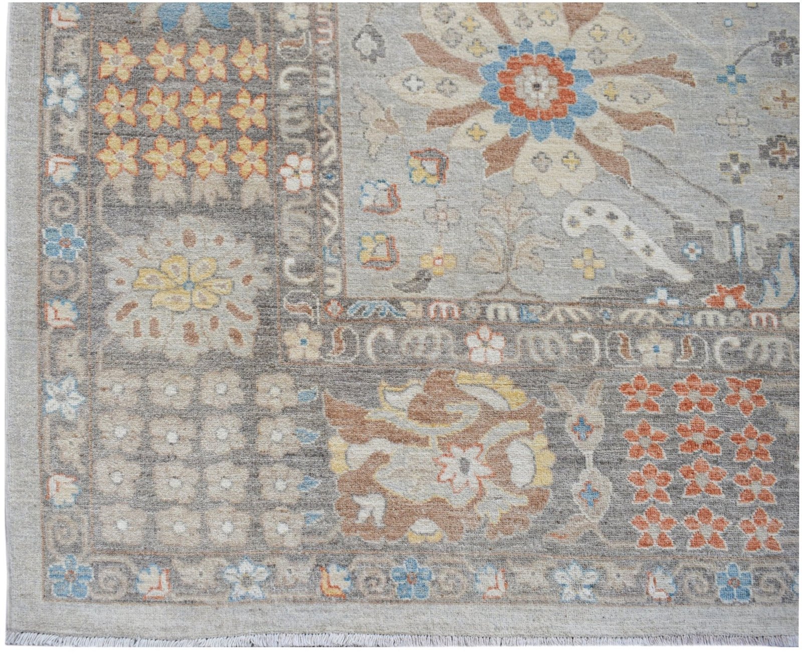 This is a beautiful handwoven transitional Oushak rug, featuring a sophisticated and muted palette. The central field is predominantly a soft light gray, providing a contemporary foundation for the traditional Oushak motifs. These intricate floral and geometric patterns are woven in lovely contrasting colors, including subtle tones of pale blue, terracotta orange, soft beige/gold, and touches of cream and taupe. The design artfully balances classic Persian style with modern coloring, making it a highly transitional piece. A multi-layered border frames the central design, repeating the primary colors and patterns to offer a cohesive and elegant finish. The rug’s construction—likely wool—suggests both a soft underfoot feel and the durability needed for high-traffic areas, making it an excellent anchor piece for a living room, dining room, or large bedroom.