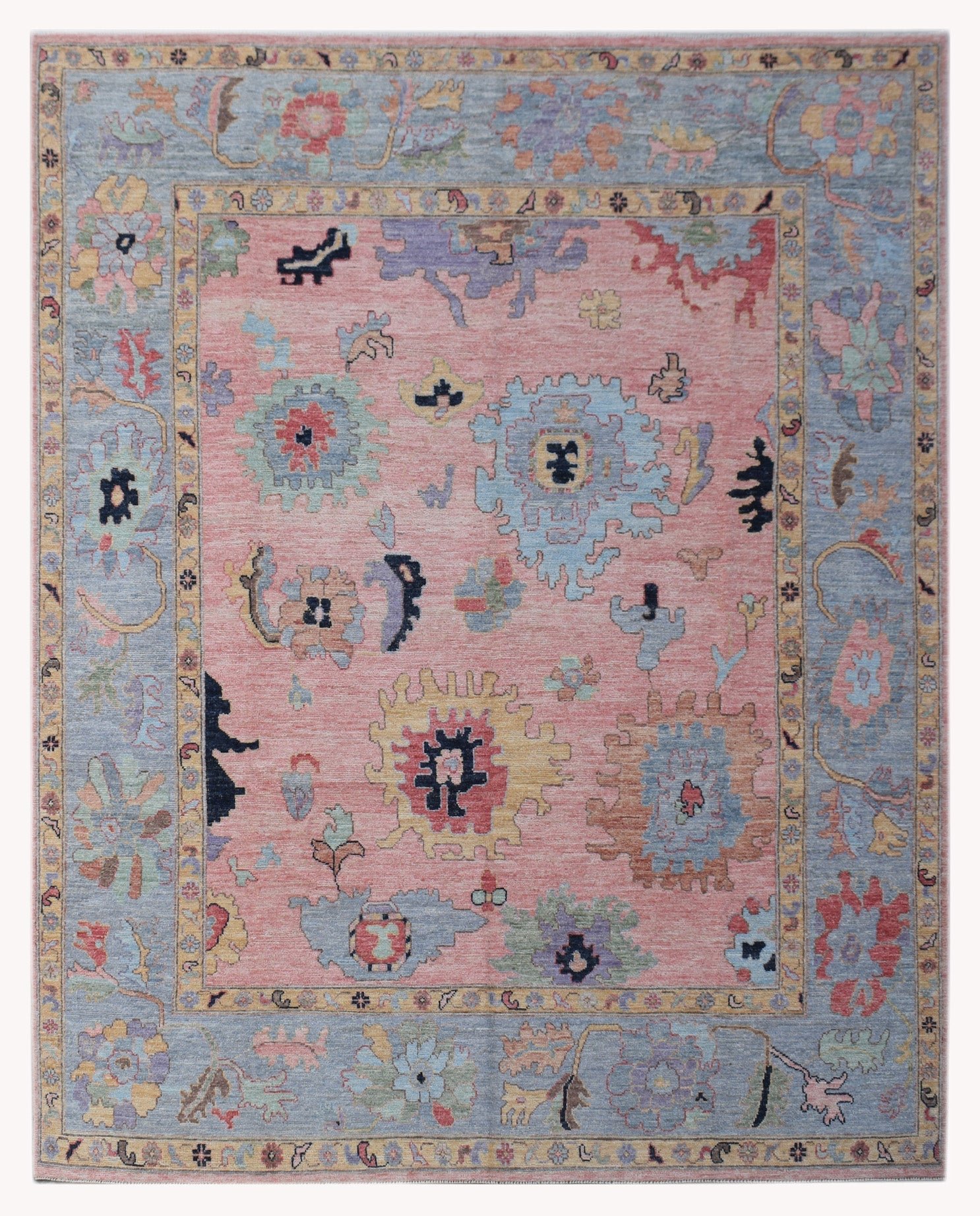 This striking hand-knotted transitional Oushak rug is a vibrant and artistic piece designed to serve as a stunning focal point in any room. The central field is dominated by a bold blush pink or rose color, providing a warm and energetic backdrop for the stylized, oversized floral motifs. These abstract blossoms are rendered in a charmingly cheerful multi-color pastel palette, featuring prominent strokes of sky blue, soft yellow, pale green, and lavender. A sophisticated grey-blue border beautifully frames the lively center, providing a grounding contrast and anchoring the whole design. Crafted from high-quality wool, this rug offers a soft, durable texture and a charming, whimsical interpretation of the traditional Oushak style, making it a perfect fit for contemporary or eclectic interiors.
