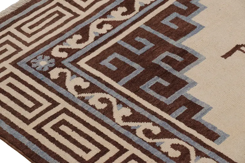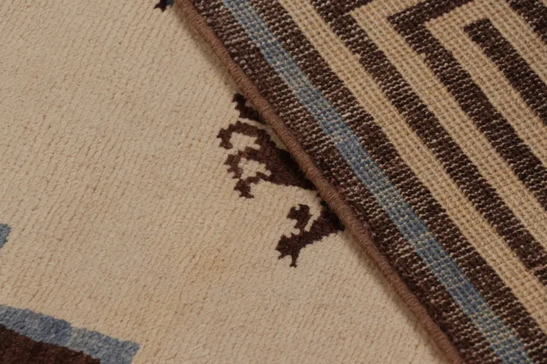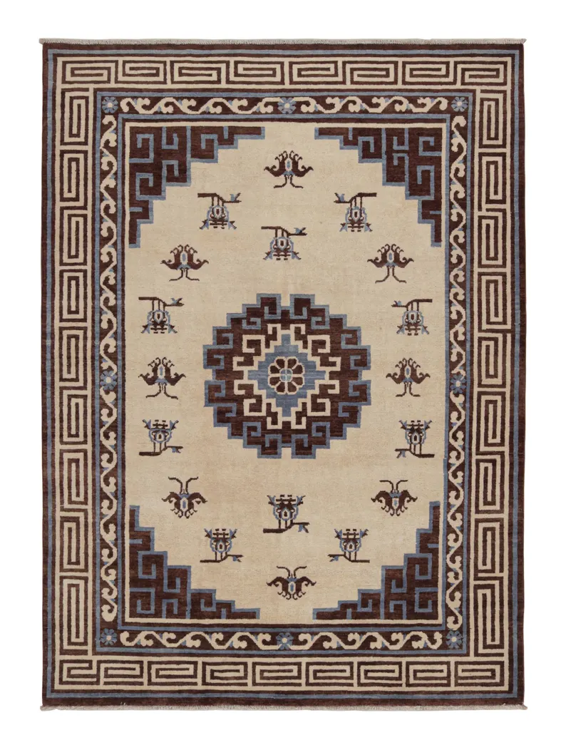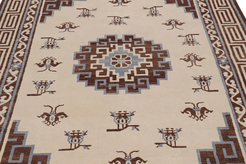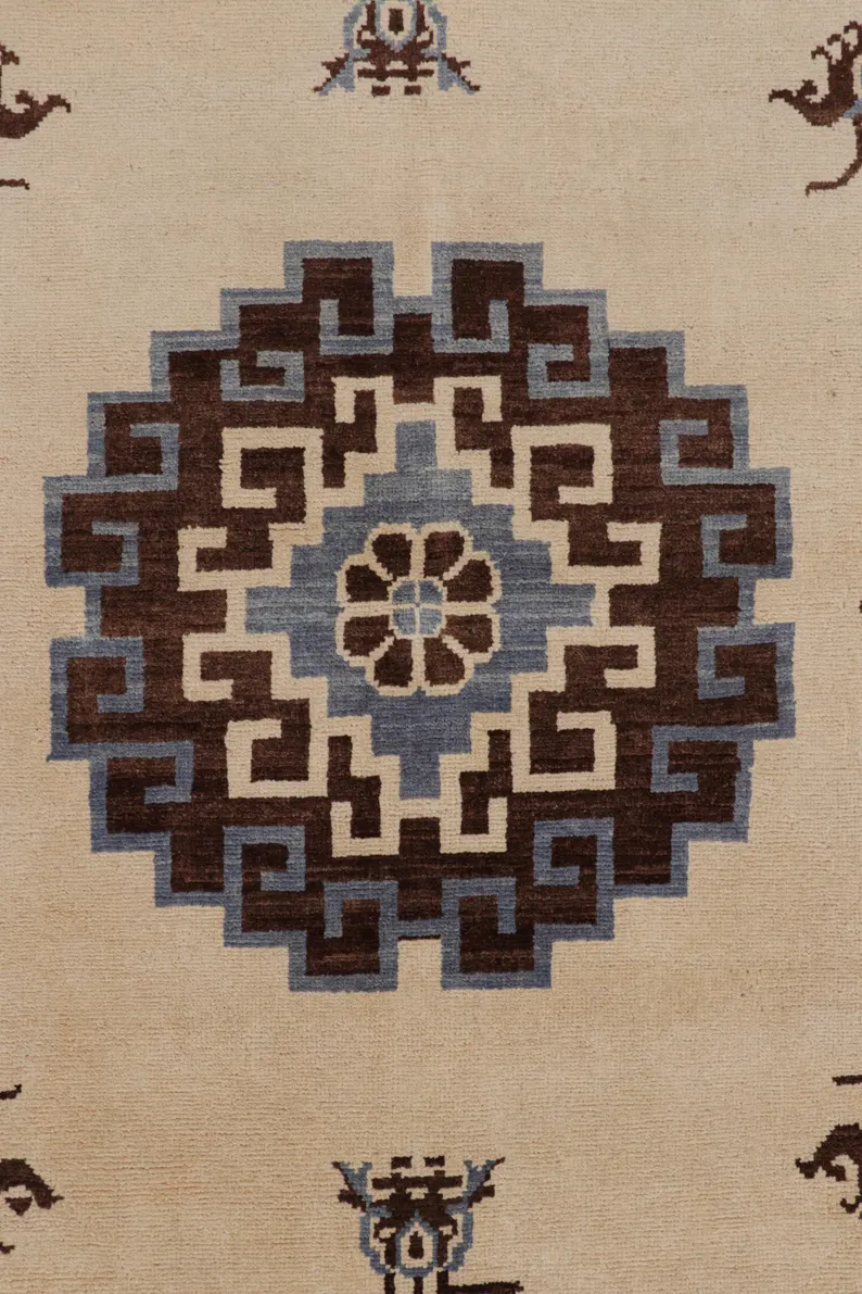 Elevate your interior with this Handmade Tibetan Wool Rug, designed with a striking geometric medallion pattern in rich brown and soothing blue on a soft ivory background. Featuring bold borders and symbolic motifs, this oriental carpet reflects timeless Tibetan artistry and craftsmanship. Woven from premium-quality wool, it offers exceptional durability, warmth, and comfort underfoot, making it ideal for high-traffic areas like the living room, dining room, or office. Its versatile color palette blends seamlessly with modern, classic, and bohemian interiors, serving as both a functional floor covering and a captivating statement piece in your home décor.
