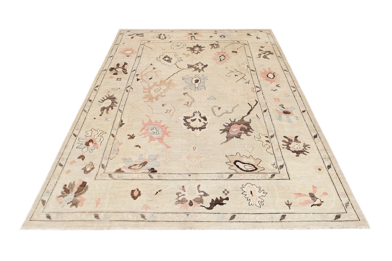 This exquisite hand-knotted Transitional Oushak rug showcases a harmonious blend of traditional artistry and contemporary design. It features an expansive, soft cream to beige field with an open, simplified floral motif scattered across the surface, giving it a modern, airy feel. The large-scale botanical elements are rendered in a sophisticated, muted palette of chocolate brown, soft taupe, dusty rose pink, and pale blue, framed by a delicate, angular inner and outer border. The neutral background and subtle colors make this piece a versatile anchor for a variety of spaces, adding texture, warmth, and quiet elegance without overwhelming the existing decor.