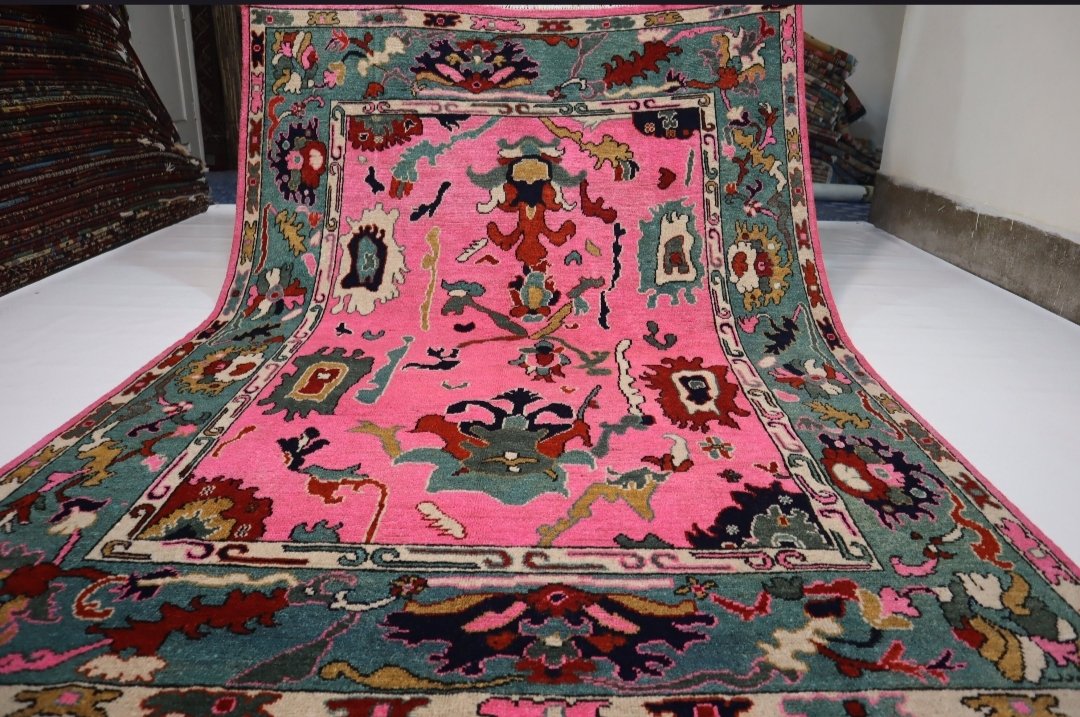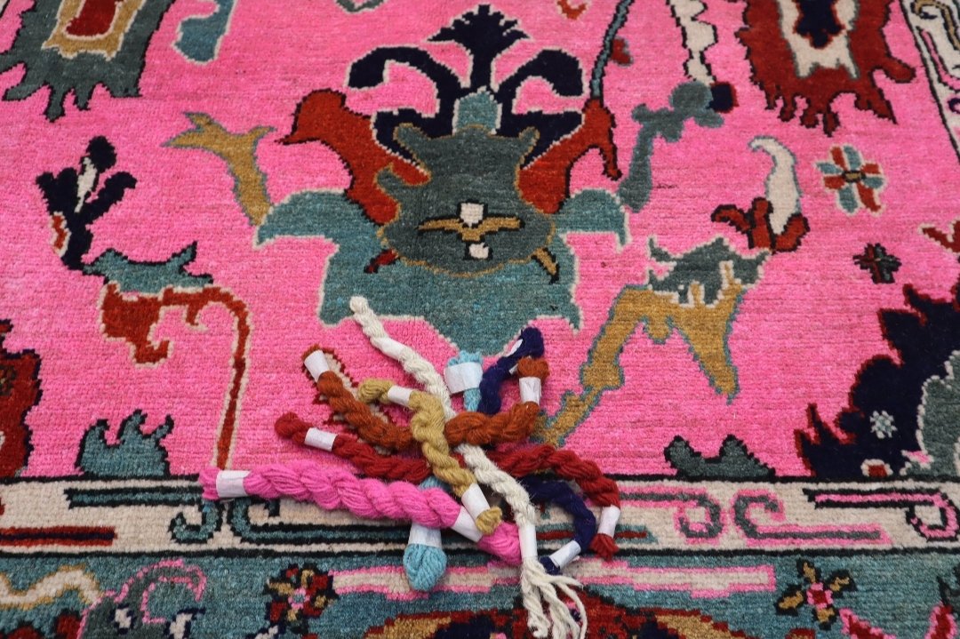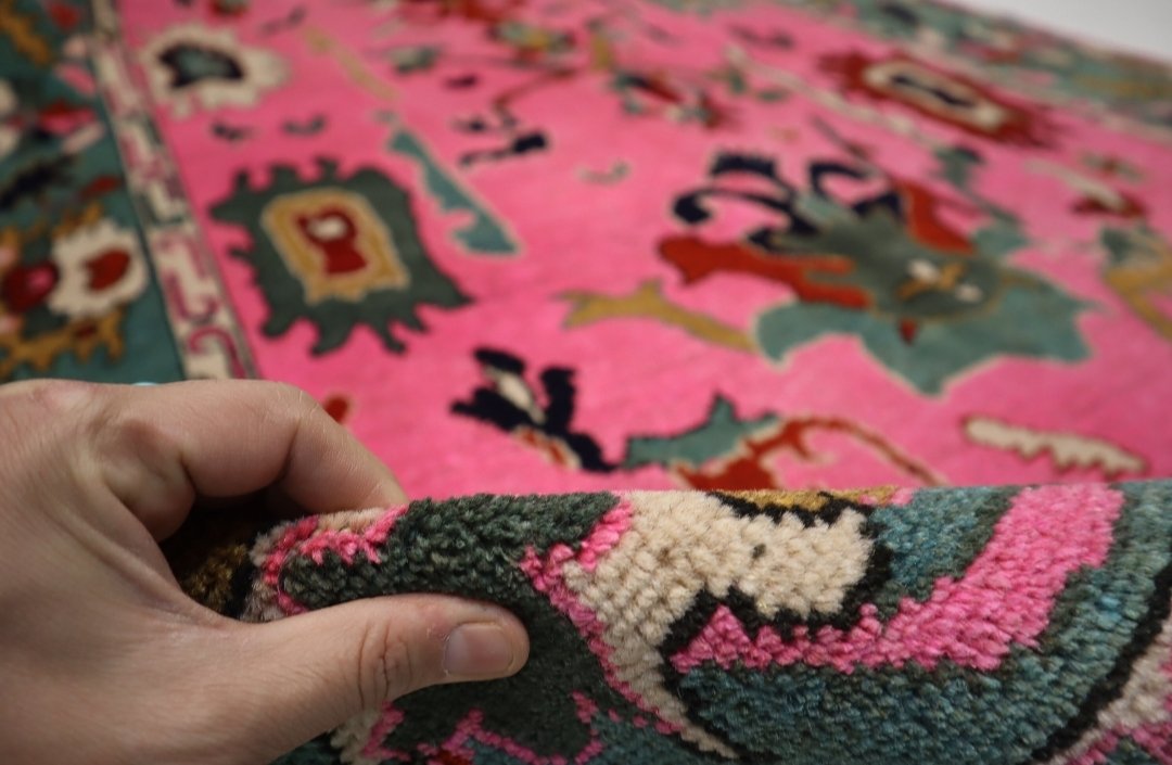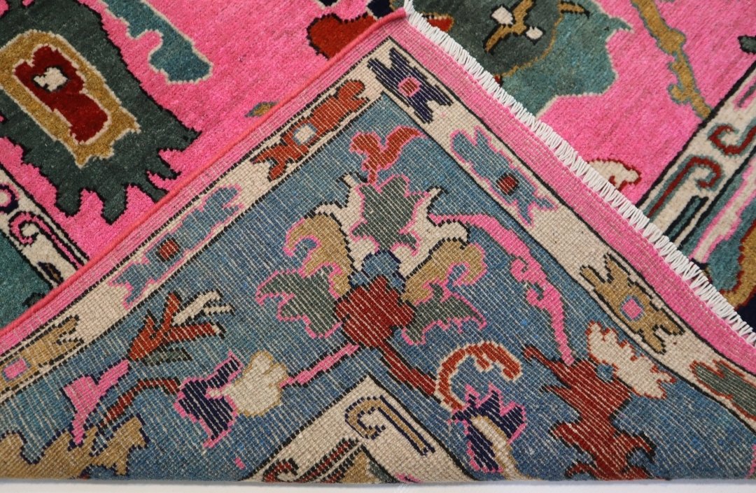Make an unforgettable statement with this truly unique and vibrant hand-knotted wool rug. This eye-catching piece flips traditional design on its head, featuring a brilliant, saturated fuschia or hot pink field accented by a dramatic aqua or teal border. The rug showcases a playful, abstract-botanical design that blends classic Oriental motifs with a modern, artistic flair. Intricate patterns in complementary colors like deep navy, forest green, burnt orange, and cream add depth and sophistication. Crafted from premium wool, this rug provides a soft, luxurious feel underfoot while ensuring exceptional durability and resilience for high-traffic areas. This stunning, high-contrast palette makes it the perfect anchor piece for a Bohemian, Eclectic, or Maximalist living room, bedroom, or creative space, guaranteeing a spectacular pop of personality wherever it is placed.