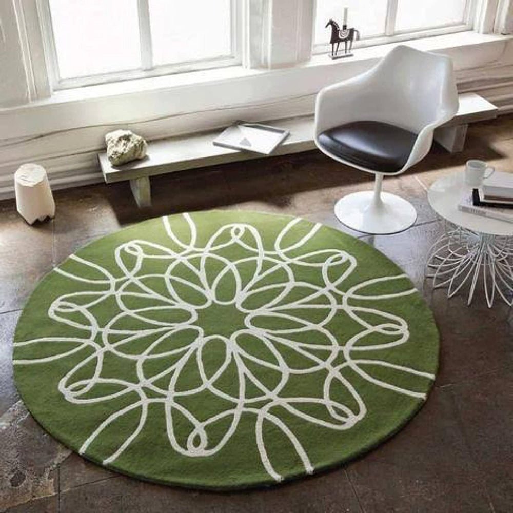 Modern Green Round Rug – Abstract Floral Looping Pattern, Lime Vibrant