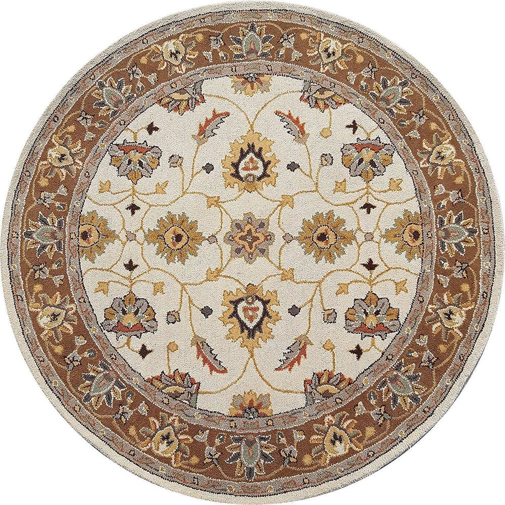 Add timeless charm to your home with this traditional round Oriental area rug, featuring an intricate floral medallion design in warm beige, brown, and gold tones. Perfect for creating an inviting atmosphere, this rug blends classic elegance with modern durability.