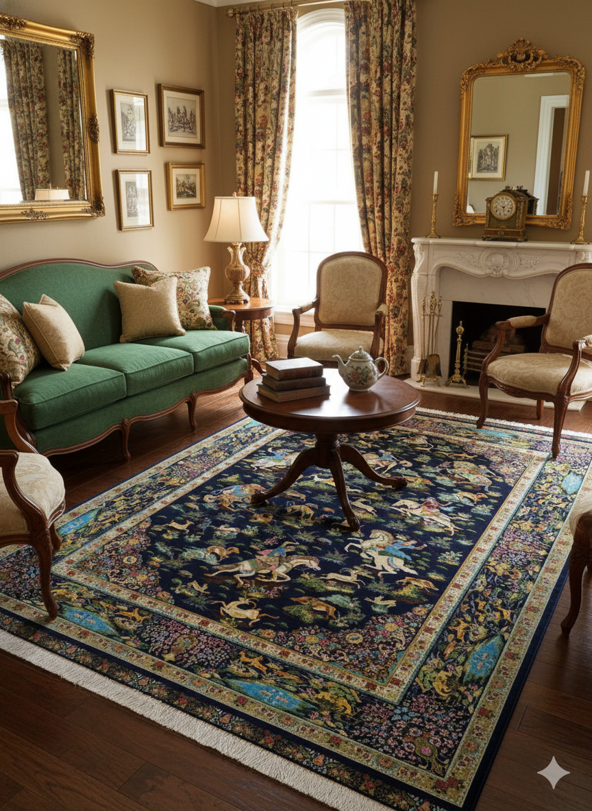 Step into a world of timeless elegance with our exquisite Persian-Inspired Hunting Scene Area Rug. This magnificent piece features a captivating navy blue field adorned with an intricate depiction of a traditional hunt, showcasing graceful riders, noble horses, and a variety of wild animals amidst lush flora. Each detail, from the vibrant multi-color palette to the ornate floral borders, is meticulously crafted, transforming this rug into a true work of art. Perfect for adding a touch of classic sophistication and a rich narrative to your living room, dining area, or study, this rug promises to be a cherished centerpiece for years to come.